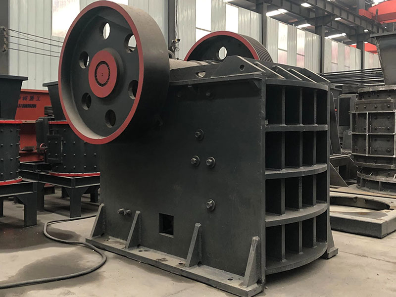 颚式破碎机主要由机架、偏心轴、大皮带轮、飞轮、侧护板、肘板、肘板后座、调隙螺杆、复位弹簧、固定颚板与活动颚板等组成。