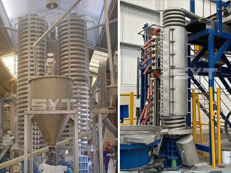 垂直振动提升机可以对颗粒状、块状、粉状的固体物料(粘度不大)都可以输送,是我厂生产的一种新型的垂直振动输送设备。采用振动电机作振动源,利用两振动电机的合成振幅,将物料沿螺旋输送槽向上输送。
